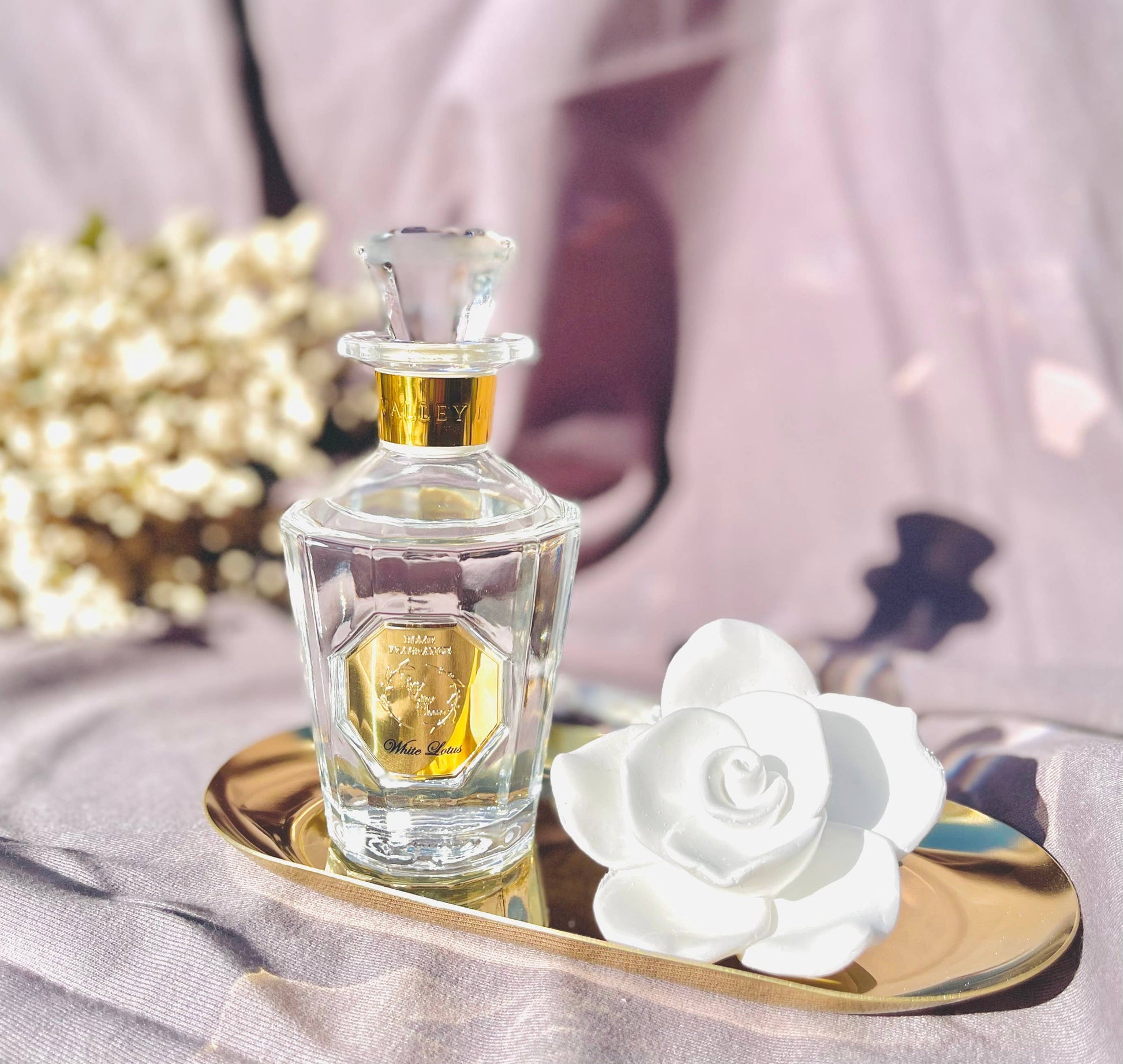 White Lotus - serene image of a lotus flower gracefully floating on still waters with delicate notes of Lilies, refreshing clementines, watery notes while soft musk lingers in the background.