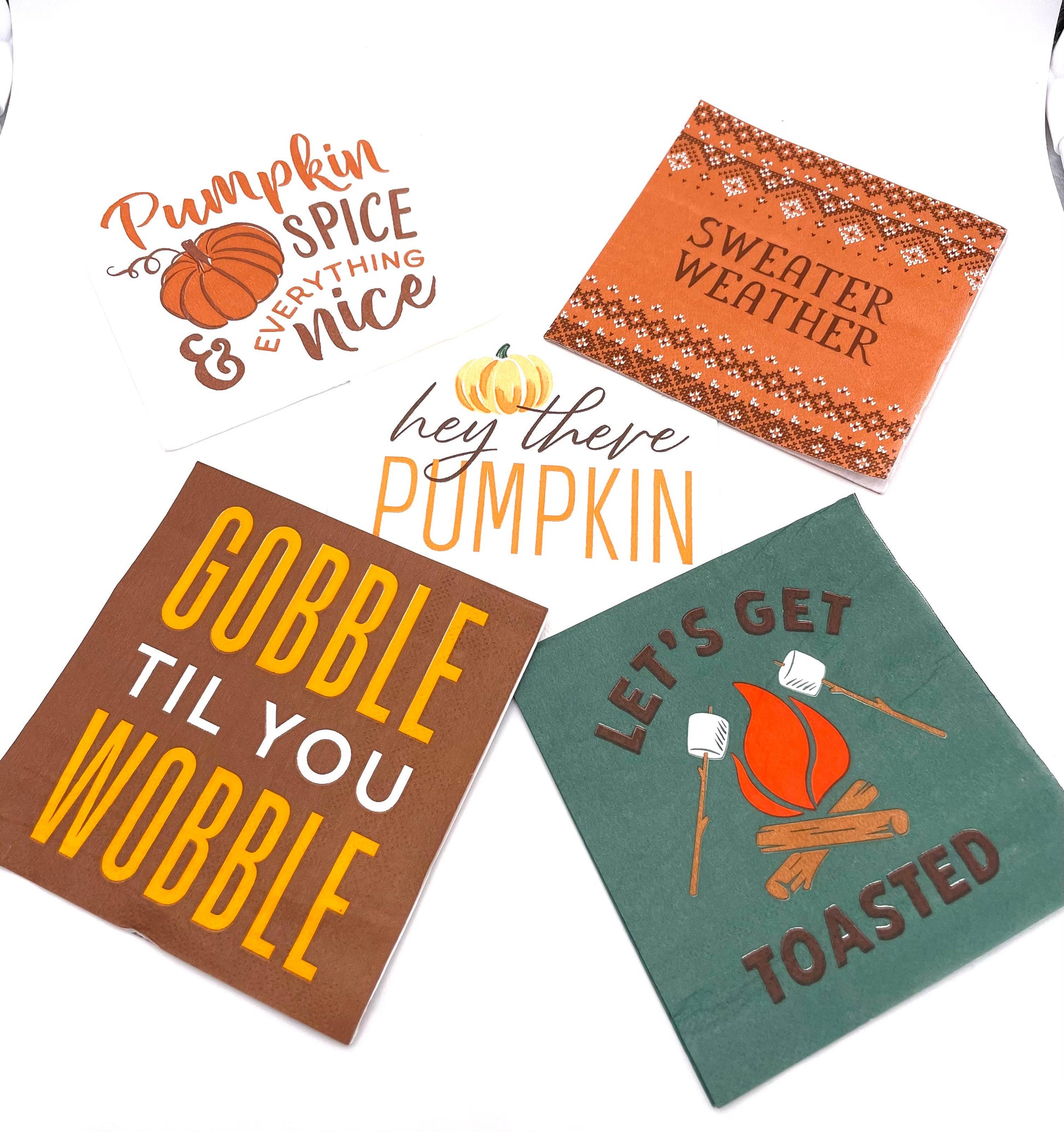 These funny Fall/Harvest/Thanksgiving themed beverage napkins are perfect for tabletop decoration and will add a touch of humor to your Thanksgiving/Friendsgiving celebration. These soft and absorbent napkins help in cleaning stains and spills with great ease. You can use these paper napkins for your gathering or party. The party themed design on the napkins makes them a great fit for any fall gathering or perfect for a hostess gift.